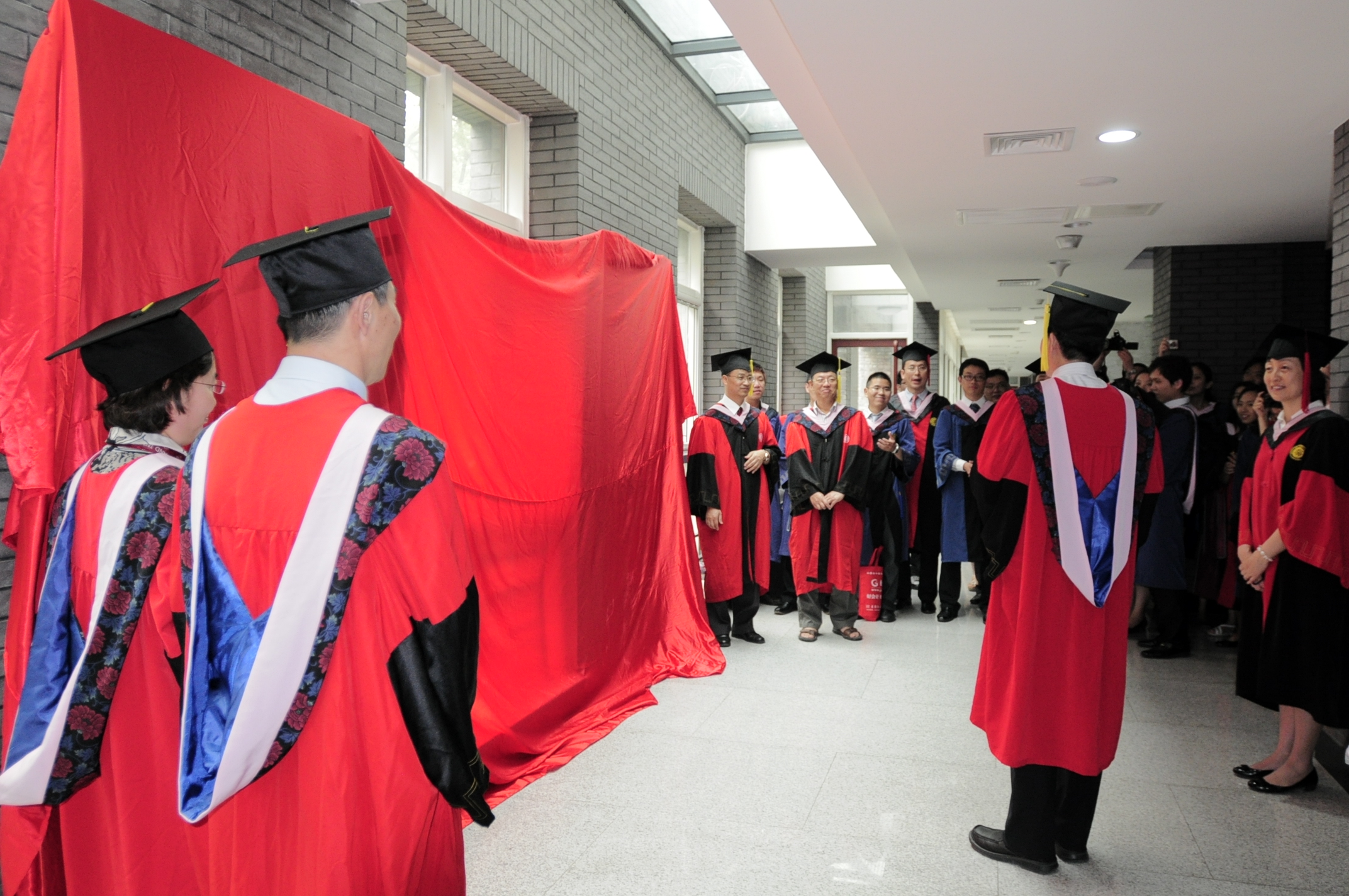 在教育学院全体毕业生与老师集体合影后,学院举行了院友墙揭幕仪式。闵维方、陈晓宇、文东茅、丁小浩、陈学飞等老师为写有应届毕业生名字的校友墙揭幕,并亲切地与同学们合影留念。